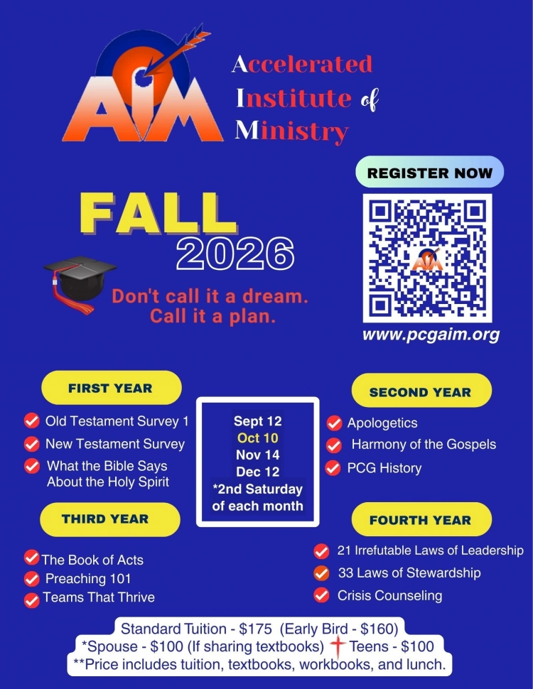 I am very excited to announce our partnership with AIM, Accelerated Institute of Ministry! Through decades we have forged a trusting relationship with Dr. Phil Redding, which has led us to a new co-laborer David Craig, the President of AIM. After months of earnest prayer, we are happy to announce that here in the PNW, we shall have several churches become a Satellite (an extentsion) of AIM. These churches will host the days of training while AIM in Arkansas is in session. Our people can register through them, do all of their work remotely and come together at our regiional satellite locations for digital class rooms, learn together, prepare for ministry together and build lifelong freindships in the PCG! The purpose of AIM is to recruit faithful followers of Jesus and assist in preparing them for ministry, embrace and engage this great harvest, go and make disciples of all nations, and plant churches throughout the PNW.For this Cause,